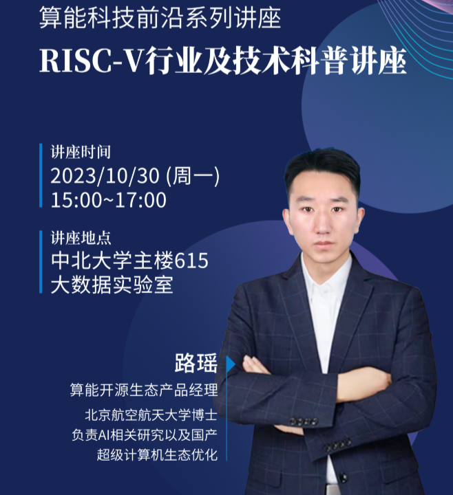 2023年10月30日,算能科技有限公司“RISC-V行业及技术讲座”在我校主楼615大数据实验室成功举办。算能开源生态产品经理路遥博士为全校100余名关注RISC-V的学生带来了生动的报告,并在讲座后进行了基于RISC-V开发板的边缘设备人工智能算法部署现场实操。