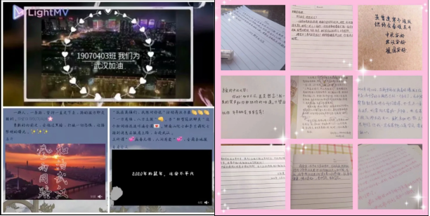 从学生到老师,我们无一不心系武汉。虽然我们无法站在抗疫一线为英雄们拭去额头的汗水,但是我们可以将必胜的信心通过春天的微风送去武汉。19070401团支部组织开展“左”手写祝福、收集感人事迹照片墙的方式让同学们对抗疫工作更加了解;19070402团支部在网上开设解忧杂货铺,为大家解决疫情期间的烦恼与忧伤,用动听的歌声,抚平同学们焦躁不安的心情,他们说“无论何时,我都能做你最安静的倾听对象”;19070403团支部组织分布在全国各地的同学们录制祝福视频,为武汉加油助威;19070404团支部开展“祖国,我想对你说”活动表达对祖国的滔滔敬佩之情。