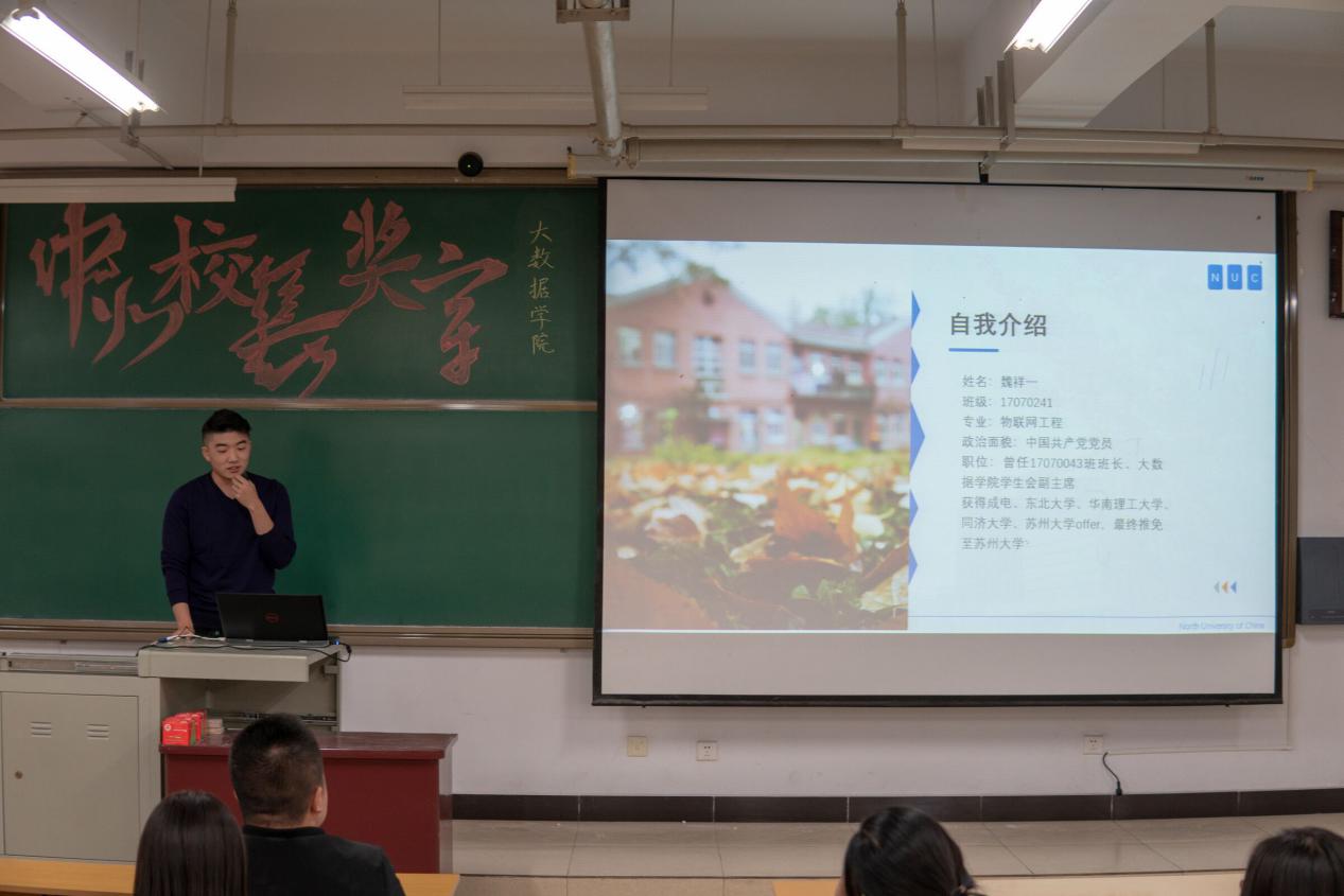 魏祥一学长分享了自己各个时期的感受:大一很迷茫,大二学会了统筹规划,大三完全进入节奏,学习科研两不误。告诉我们大学应该怎样度过:首先要给自己定目标,肯定需要一个终极目标,然后在每个时间段要实现一个个小目标;其次要坚持;最后要让自己快乐。他还为我们详细地介绍了实验室,鼓励我们要多向实验室的学长学姐汲取经验,有领路人带你前行会比自己一人摸索更加高效,方向更加清晰。并且多参加学科竞赛,对自己能力的提高大有裨益。最后,魏祥一学长举了学科交叉的例子,提醒我们要学好各科知识,化抽象为具体,同学们听后收获颇多。