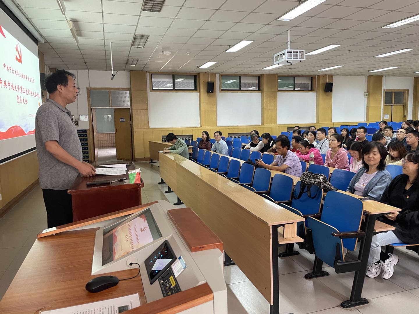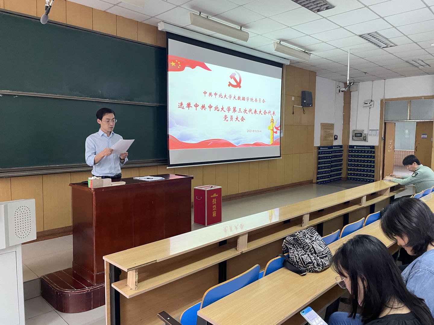 第三次代表大会代表选举党员大会在11108H会议室召开,学院全体师生党员参加,会议由院党委书记郭书杰主持。