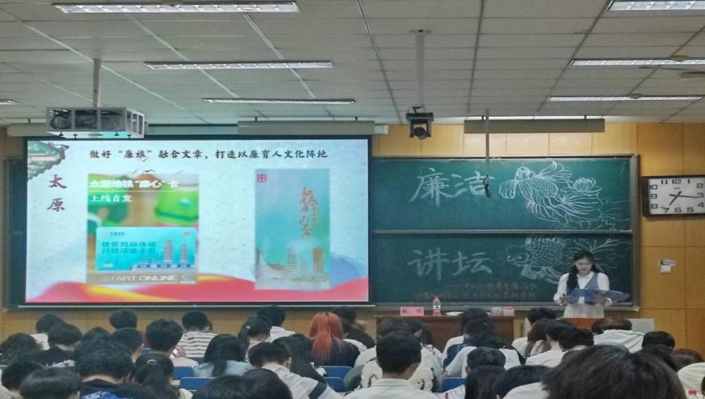 之后,她将廉洁文化与山西联系在了一起,讲述了太原举办“清廉山西,与我同行”的活动、运城发扬柳宗元廉政文化思想的实例,还有大同加强对平型关大捷抗日遗址的建设等活动,使同学们切身感受到了身边的廉洁文化。