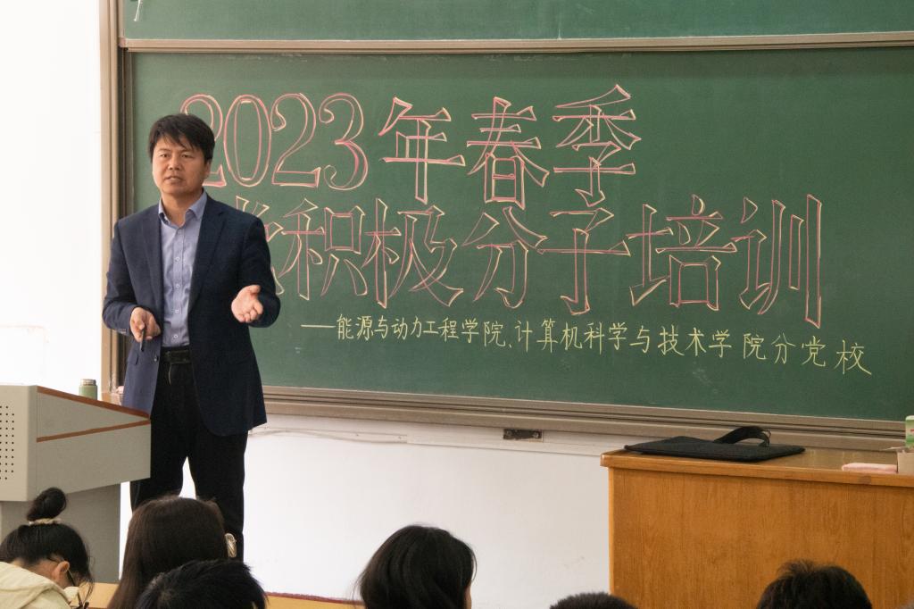 随后能源与动力工程学院党委书记顾宁为学员们讲解《学党史不忘来时路,跟党走奋进新征程》,他为学员们讲述中共一大到中共二十大之间的每个重要会议,详细讲解了每次会议的重要内容和历史意义。