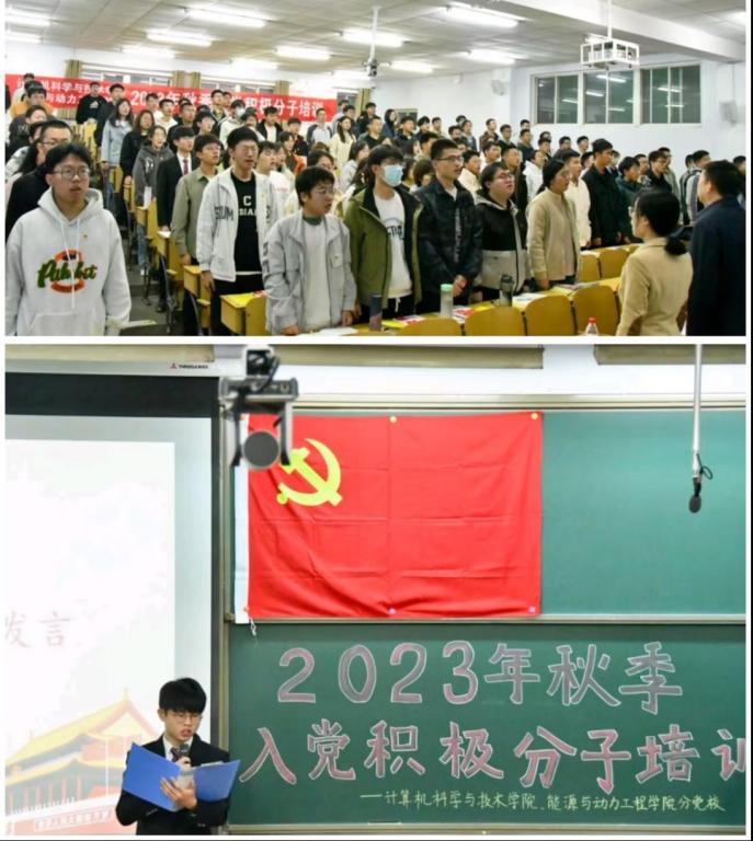 11月5日上午,开班典礼在庄严的国歌声中拉开了序幕,计算机科学与技术学院党委书记喻华兵、能源与动力工程学院党委书记顾宁、能源与动力工程学院党委副书记任雁、能源与动力工程学院组织员董雅倩、计算机科学与技术学院组织员许颜杰出席了此次开班典礼。参会领导宣读了开班致辞和结业考核要求,对参加党课的入党积极分子给予高度认可,参会领导寄语学员们通过院党课进一步加深对党的认识和理解,提高自身党性修养,力争早日成为一名合格的共产党员。计算机科学与技术学院霍克研同学代表全体学员发言,郑重承诺将严格遵守培训班的规章制度,以饱满的热情和言能践行的信心投入到此次培训中。最后,开班典礼在雄浑激昂的国际歌声中落下帷幕。