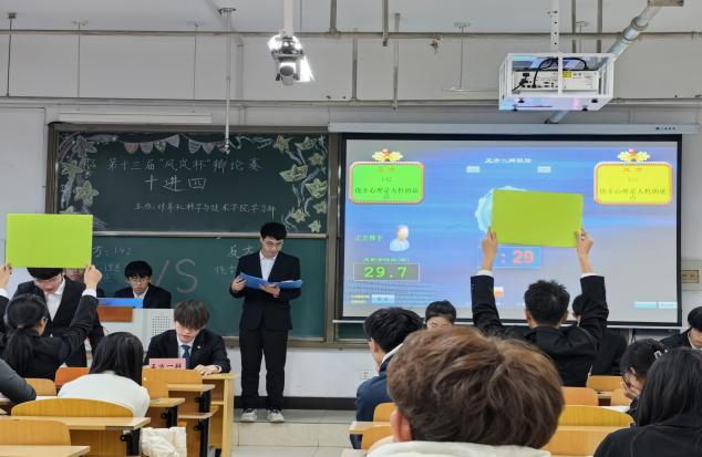 第二场比赛围绕“迟到的正义是不是正义”展开探讨。正方 242 班认为正义核心价值不变,迟到仍有救赎意义,结合司法案例说明其对公平正义的补全作用;反方 143 班强调正义时效性是核心属性,迟到的正义已失本质价值,引发了现场对公平与效率的思考。