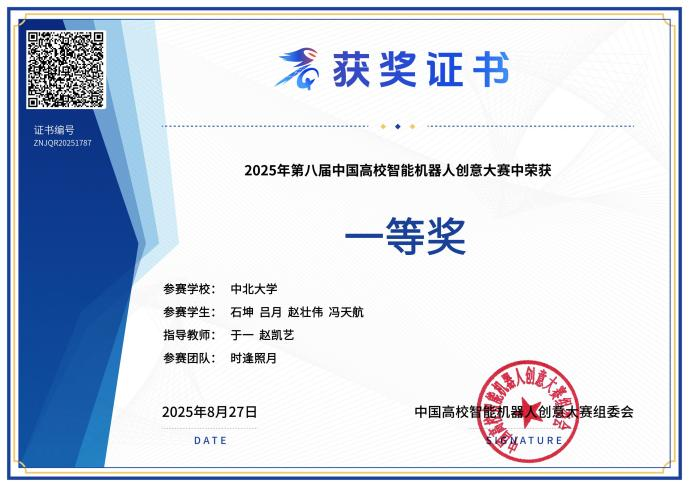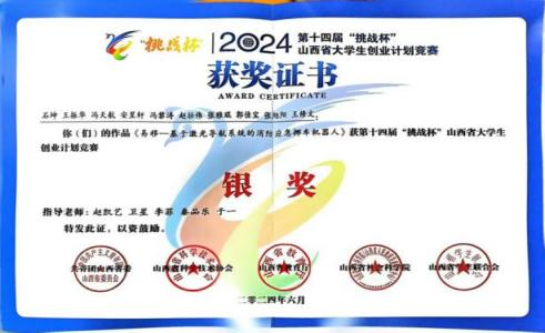 在校期间,她始终兼顾学业深耕与实践锤炼,表现十分突出。先后拿下国家奖学金、国家励志奖学金、综合素质一等奖学金、望山奖学金等多项奖学金,并成功获评校级三好学生、校级优秀学生干部、院级优秀共青团干部等荣誉称号。在学科竞赛中,她更是屡创佳绩:国家级赛事上,斩获中国高校智能机器人创意大赛国家级一等奖、2025中国机器人大赛暨RoboCup机器人世界杯中国赛国家级二等奖;省级赛事中,拿下第十四届“挑战杯”山西省大学生创业计划竞赛省级二等奖等四项省级奖项;此外,还累计收获校级奖项十余项。