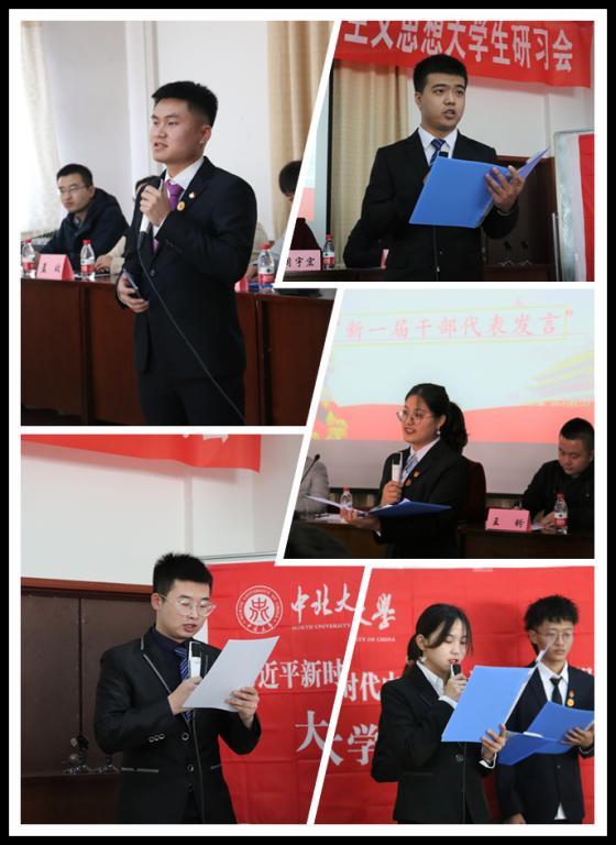 授徽仪式完毕后,新一届干部代表发言。会长白云凤同学回顾了自己的工作经历,讲述了个人成长感悟,言语间流露出的是匆匆岁月里个人与团队的成长,同时白云凤同学也提出今年的工作重心主要在内部建设和理论学习上。团支书王杰同学提出研习会的改革需要全时段推进、全方位协调,既要有制度的创新,也要有思想水平的提高,并希望所有会员撸起袖子加油干,以饱满的热情投入到研习会的工作中,实现自己的价值和意义。副会长杨宝娜同学表示研习会的成长由全体会员见证,一路的坎坷更加磨练了、坚定了全体会员们的信念,所有会员都是研习会的奠基人,都在为研习会做出自己的贡献。同时也具体讲述了自己未来在研习会的工作计划,帮助大家更好地学习理论知识,提高大家的思想建设水平。