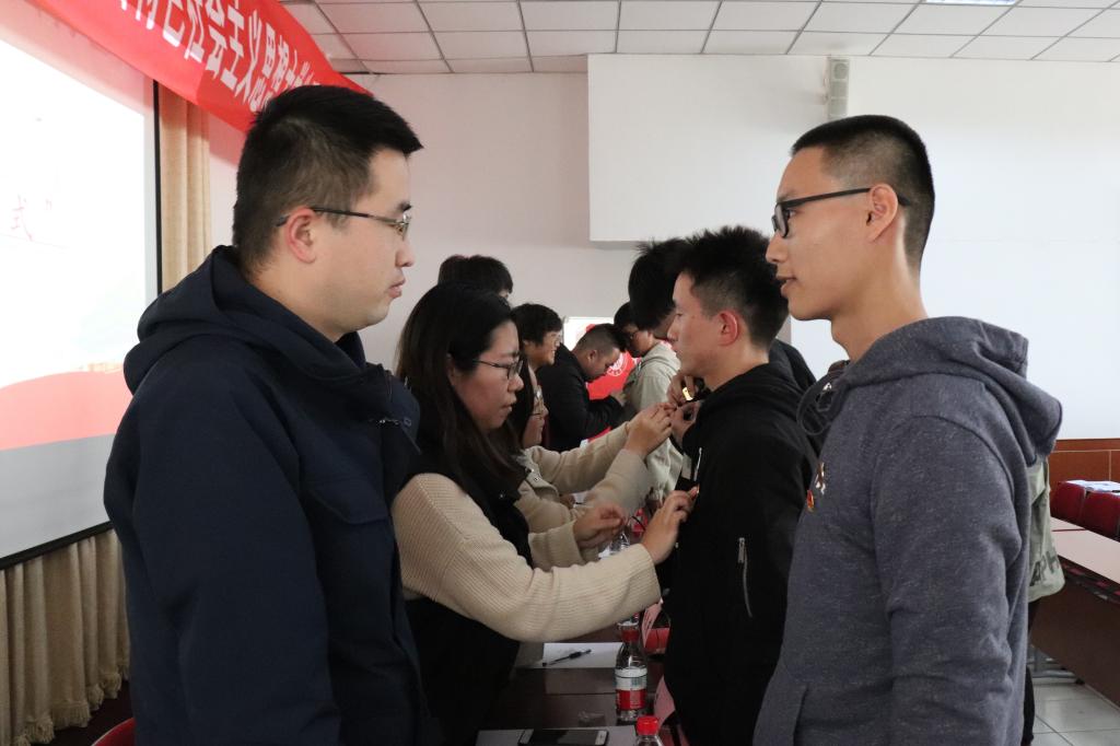 习近平新时代中国特色社会主义思想大学生研习会干部名单。紧接着是隆重的授徽仪式,各位嘉宾老师将神圣的会徽亲手佩戴在新会员代表胸前,会徽在新老成员的手中传递,“薪火相传,共建研习”。金色的会徽代表的不只是研习会的形象,还象征着研习会“不忘初心,砥砺前行,追求卓越”的精神。