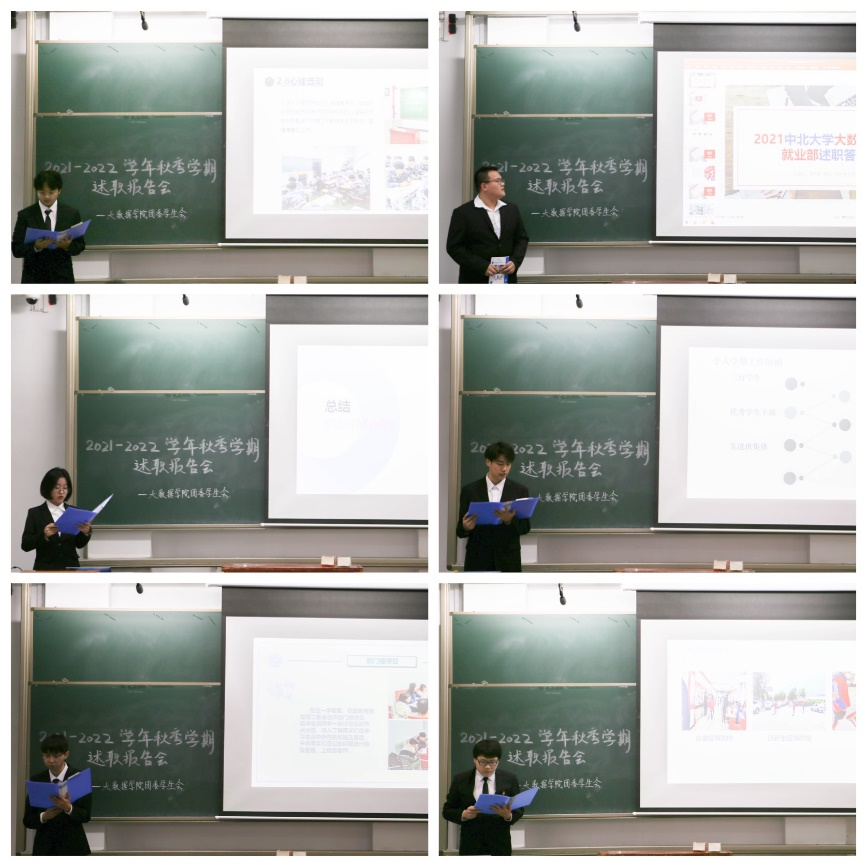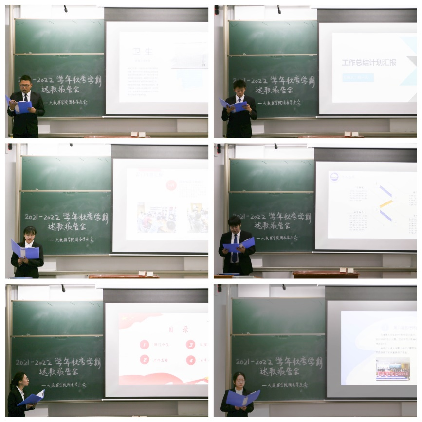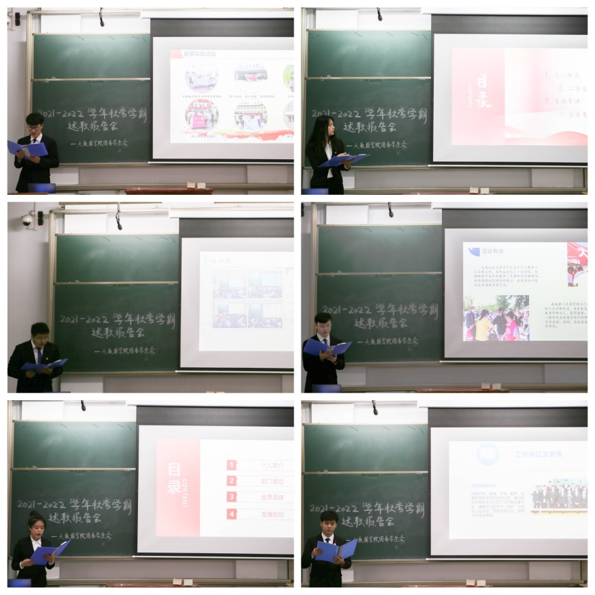 接着团委学生会主席团和各部门部长依次发言,述职人员以PPT的形式对本部门一年的工作情况做出概述,围绕重点工作开展情况,年度问题和解决办法以及新学期工作计划等方面进行汇报,脉络清晰,内容详实,充分展现出各学生组织的活力与创造力。