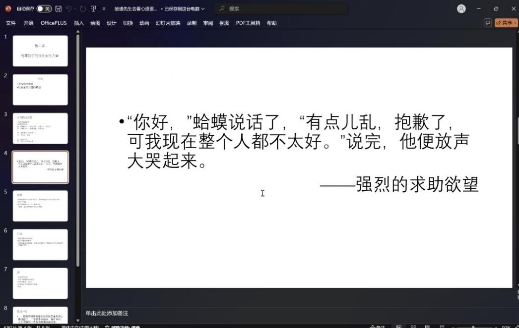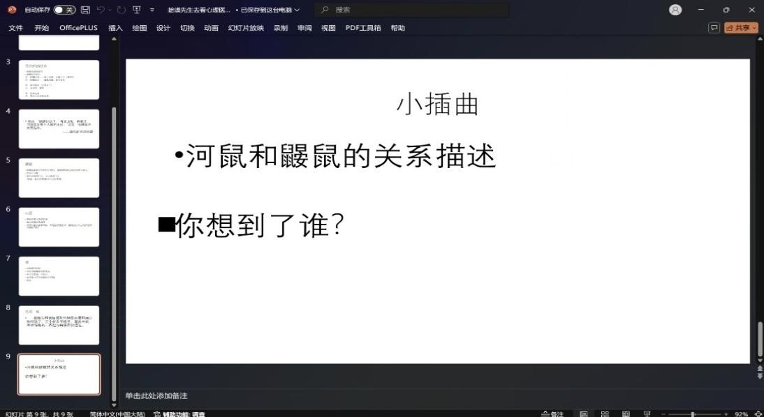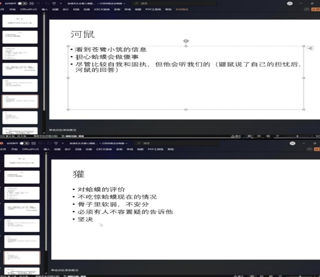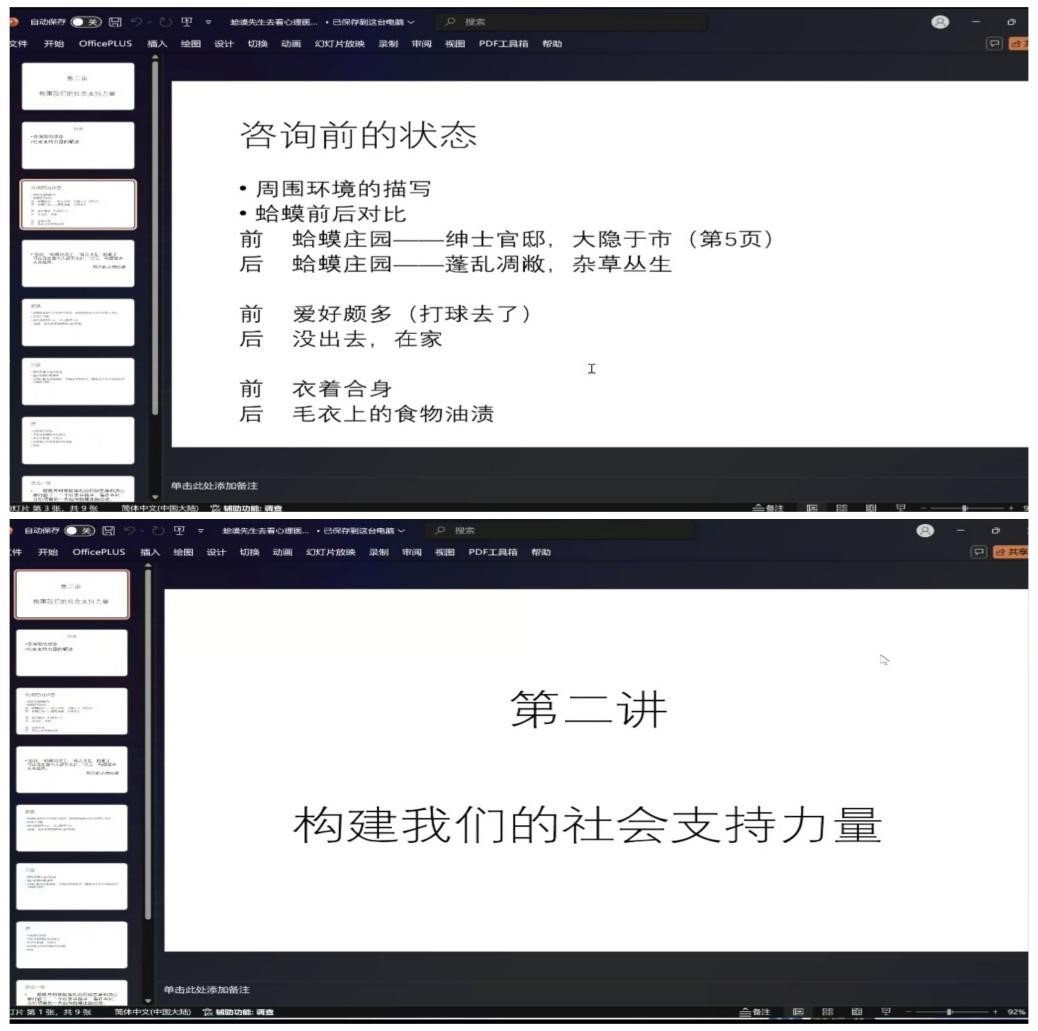 老师首先对本章进行了精彩介绍,阐述了蛤蟆先生陷入绝望到主动求助心理医生过程中蛤蟆先生的社会支持力量发挥的作用。