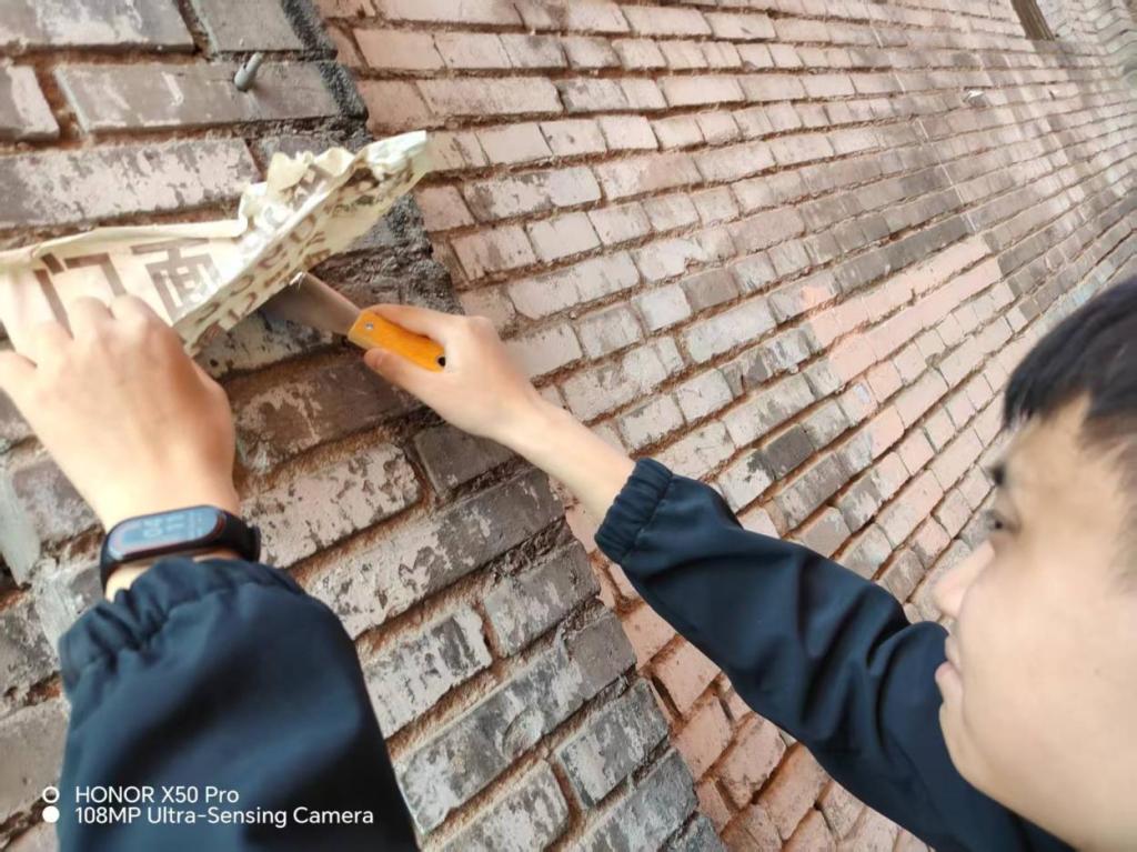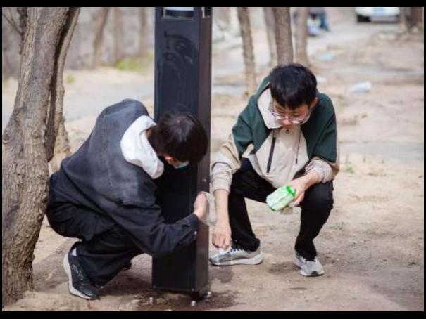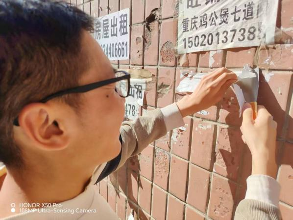 4月24日,同学们将社区划分为多个区域,各小组分别负责不同区域。清理组先用铲子、刷子等工具对楼道、电线杆、公告栏、墙面等位置的广告进行铲除,顽固污渍用清洁剂浸泡后再清理;运输组及时将清理下来的广告垃圾装入垃圾袋,并运送至指定垃圾收集点。各小组完成初步清理后,进行交叉检查,对遗漏或清理不彻底的广告再次清理,确保清理工作无死角。